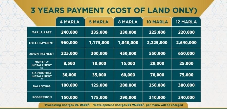The housing scheme features a range of residential plot sizes, including 4, 5, 8, 10, and 12 marla, all available on easy instalment plans to suit diverse needs. Designed with superior planning, the community offers exceptional amenities such as a commercial area, a mosque, a community centre, a health club, and round-the-clock security.