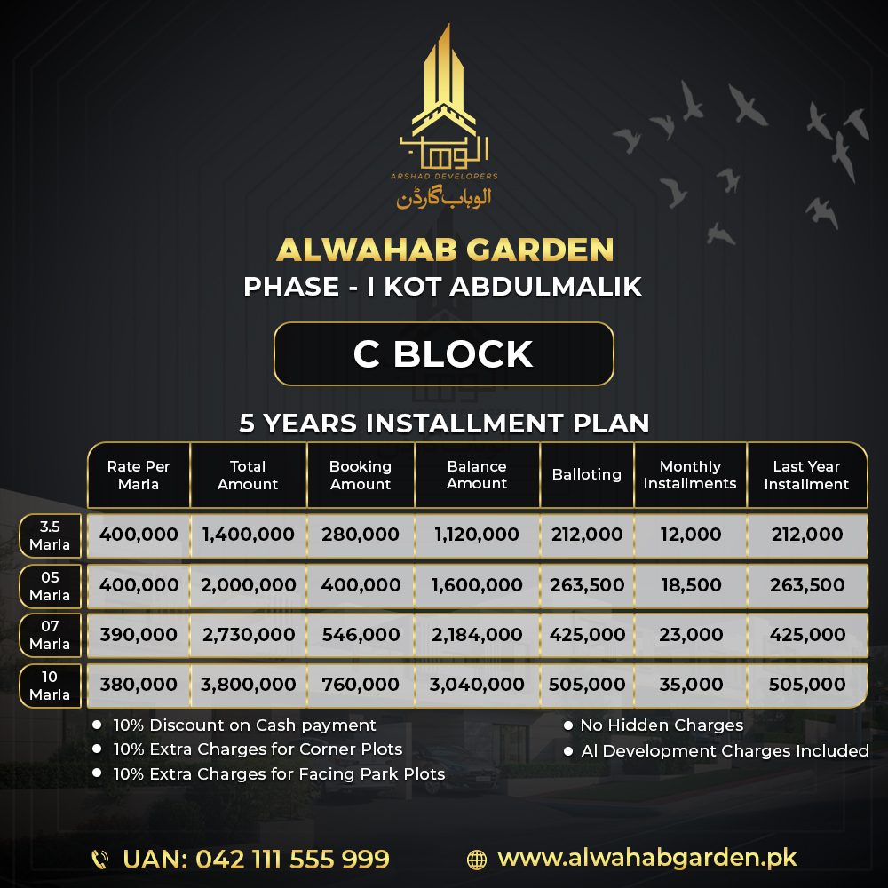 Al-Wahab Garden Phase I also includes dedicated amenity plots for schools, universities, and healthcare facilities, making it a self-sufficient community where everything you need is within reach. With flexible payment options, including easy installments and cash payment plans, owning a home in this thriving community has never been easier. The project combines modern lifestyle, convenience, and affordability, making it a perfect choice for those looking to invest or settle in a well-planned, vibrant neighborhood.