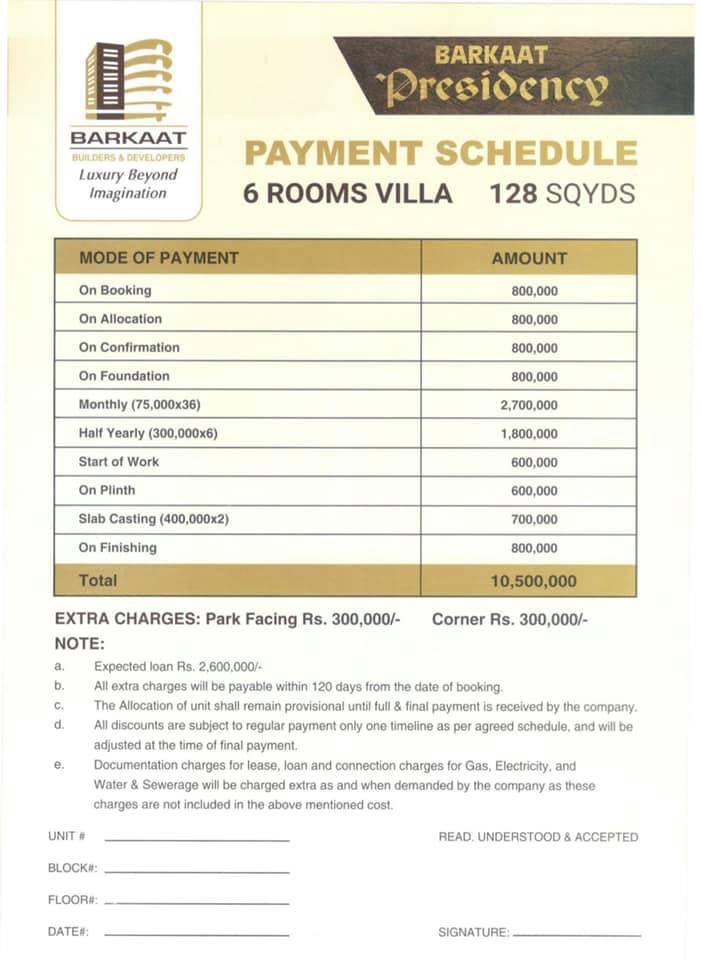 The project comprises 40 thoughtfully planned villas, each constructed on 155 square yards and featuring 6 spacious rooms, making it an ideal choice for comfortable family living. True to its promise of “Villa at the Price of an Apartment”, Barkaat Presidency provides exceptional value without compromising on space or quality.