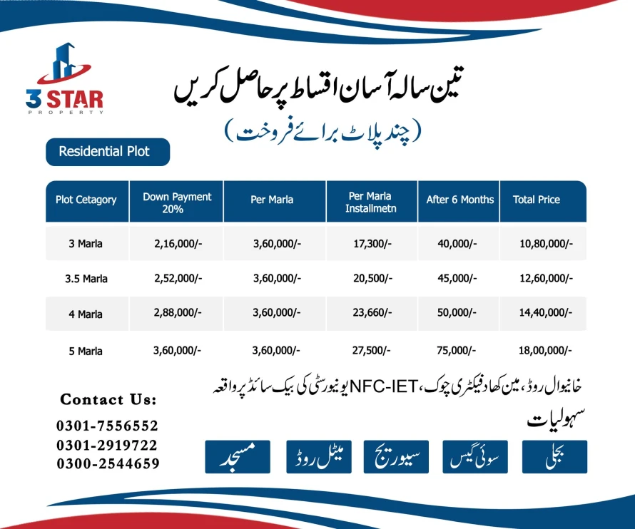 The community features 3, 3.5, 4, and 5-marla residential plots designed to suit families of all sizes. With a flexible 3-year installment plan, Bukhari Villas provides an affordable opportunity to own a home in a secure and well-connected neighborhood.