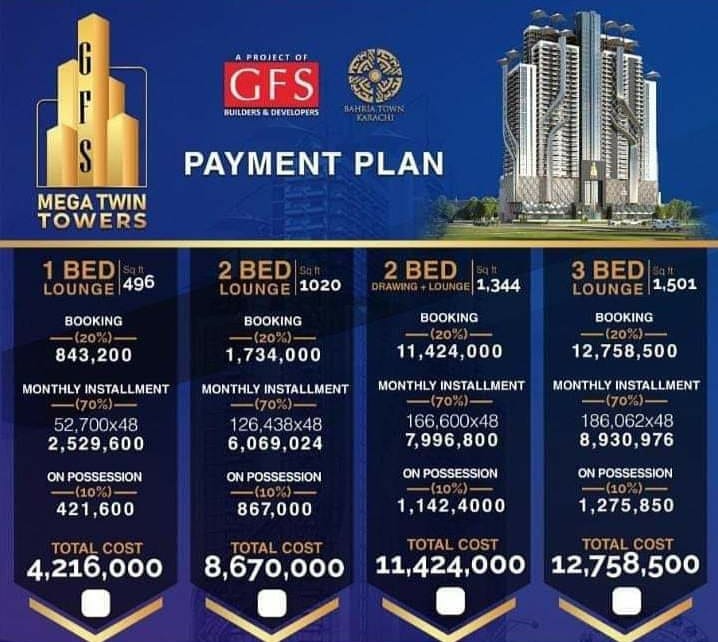 GFS Mega Twin Tower is a prestigious mixed-use development located in the strategic precincts 1 and 2 of Bahria Town, Karachi. This 7-storey architectural marvel features a stunning façade that elevates the skyline, offering both residential units and commercial outlets with spacious floorplans, elegant interiors, and striking views.