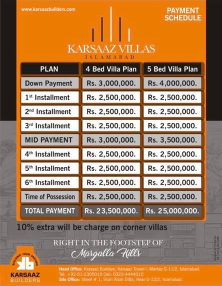 Karsaaz Villas offers a luxurious residential experience with beautifully designed villas nestled in the heart of the scenic Margalla Hills. The project provides a peaceful and comfortable lifestyle surrounded by natural beauty, making it an ideal place to build your dream home. With a convenient 2-year installment plan, it becomes accessible for families looking for premium living at flexible payment options.