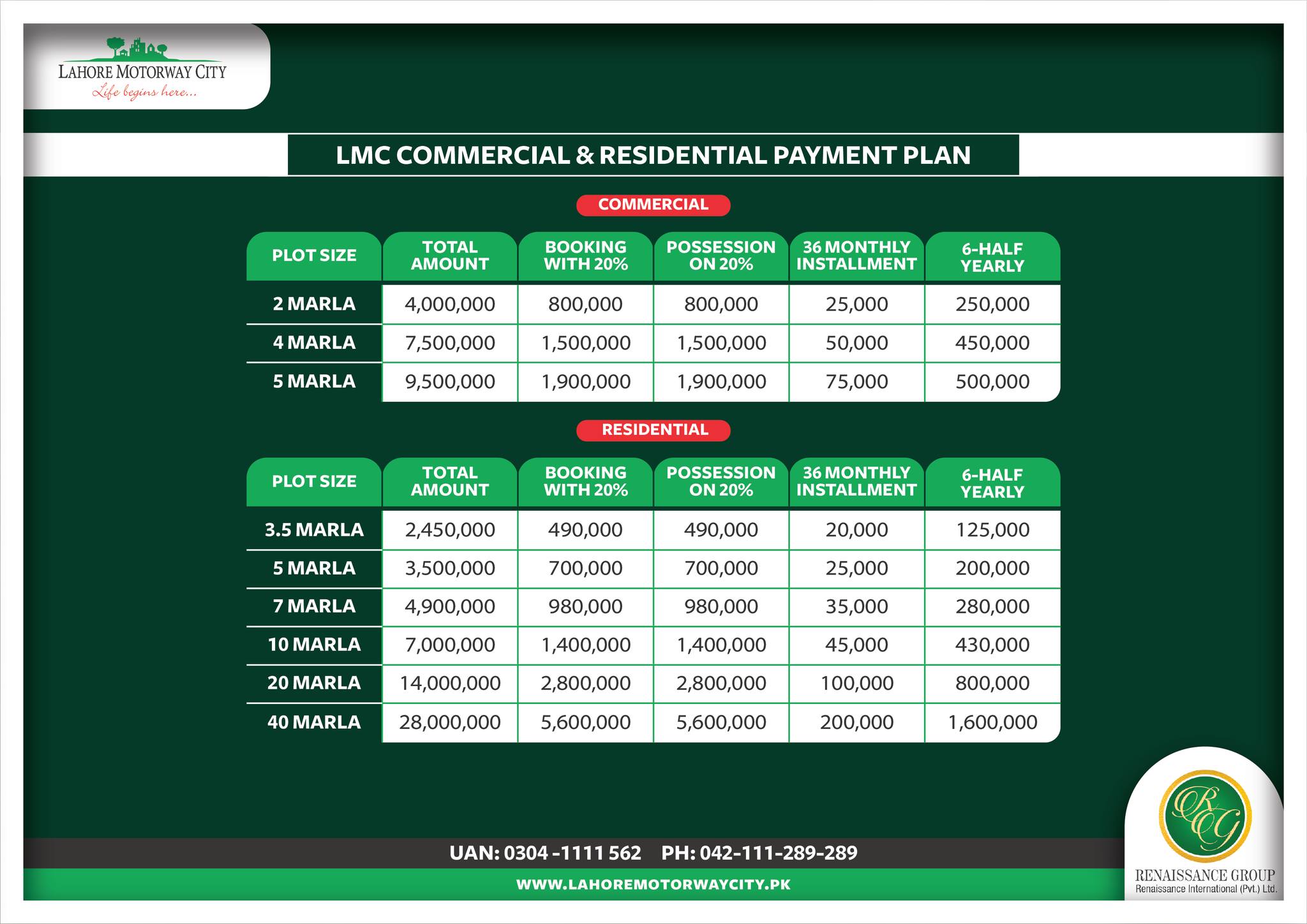 Dream Orchard includes residential and commercial plots ranging from 3.5 marla to 2 kanal, available on an easy 3.5-year payment plan, with booking starting from just PKR 240,000 and monthly installments of PKR 10,000.