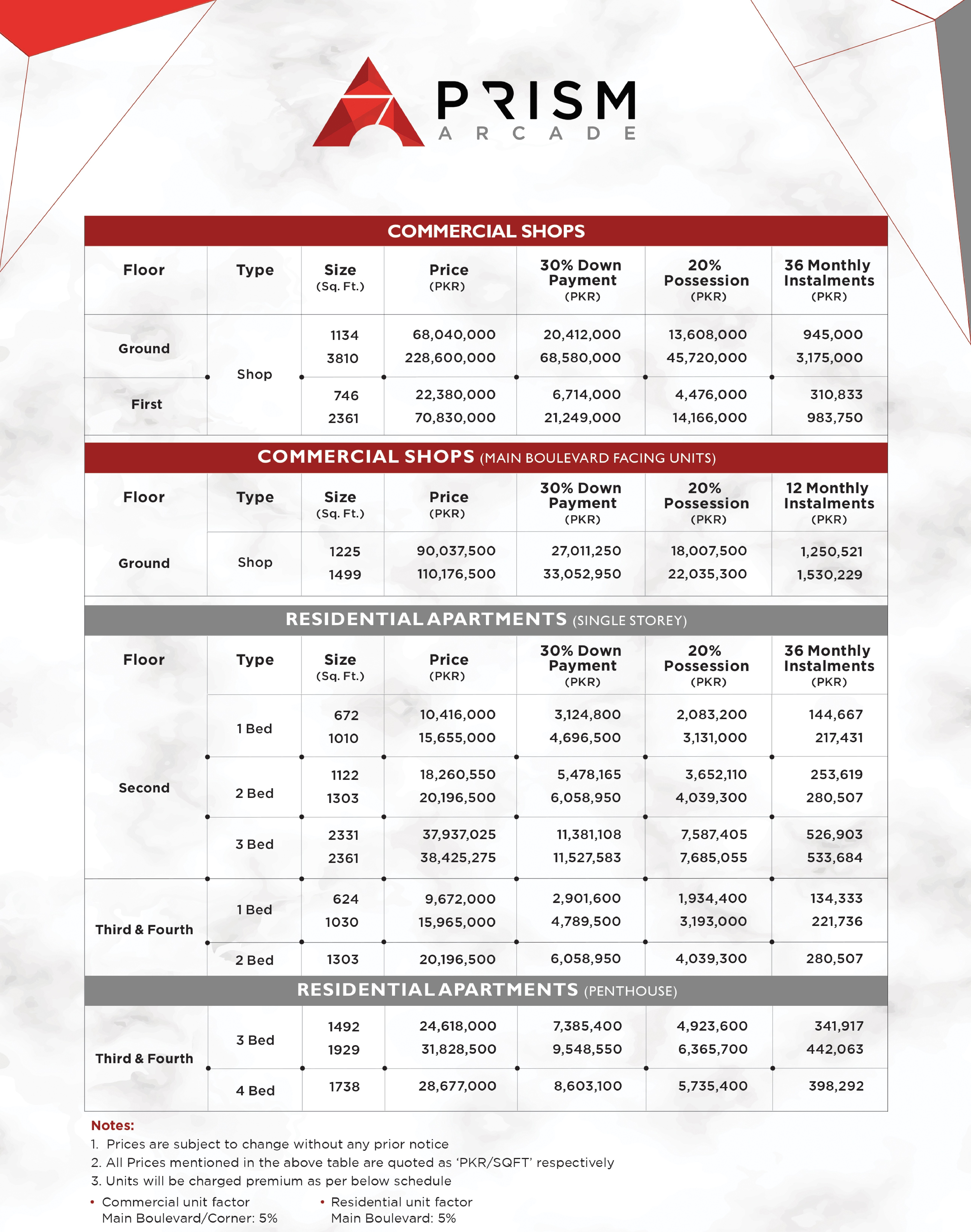 Architecturally, Prism Arcade stands out with its three-sided open corner design, tiered structure with sky-facing terraces, and dual-facing frontage along major roads. It also introduces South Punjab’s first solar façade concept, highlighting its modern and sustainable approach. Each residential unit comes with a private terrace, while commercial units are enhanced with internal lifts and double-glazed glass fronts, adding to the project’s overall sophistication and functionality.