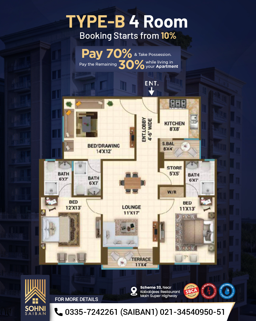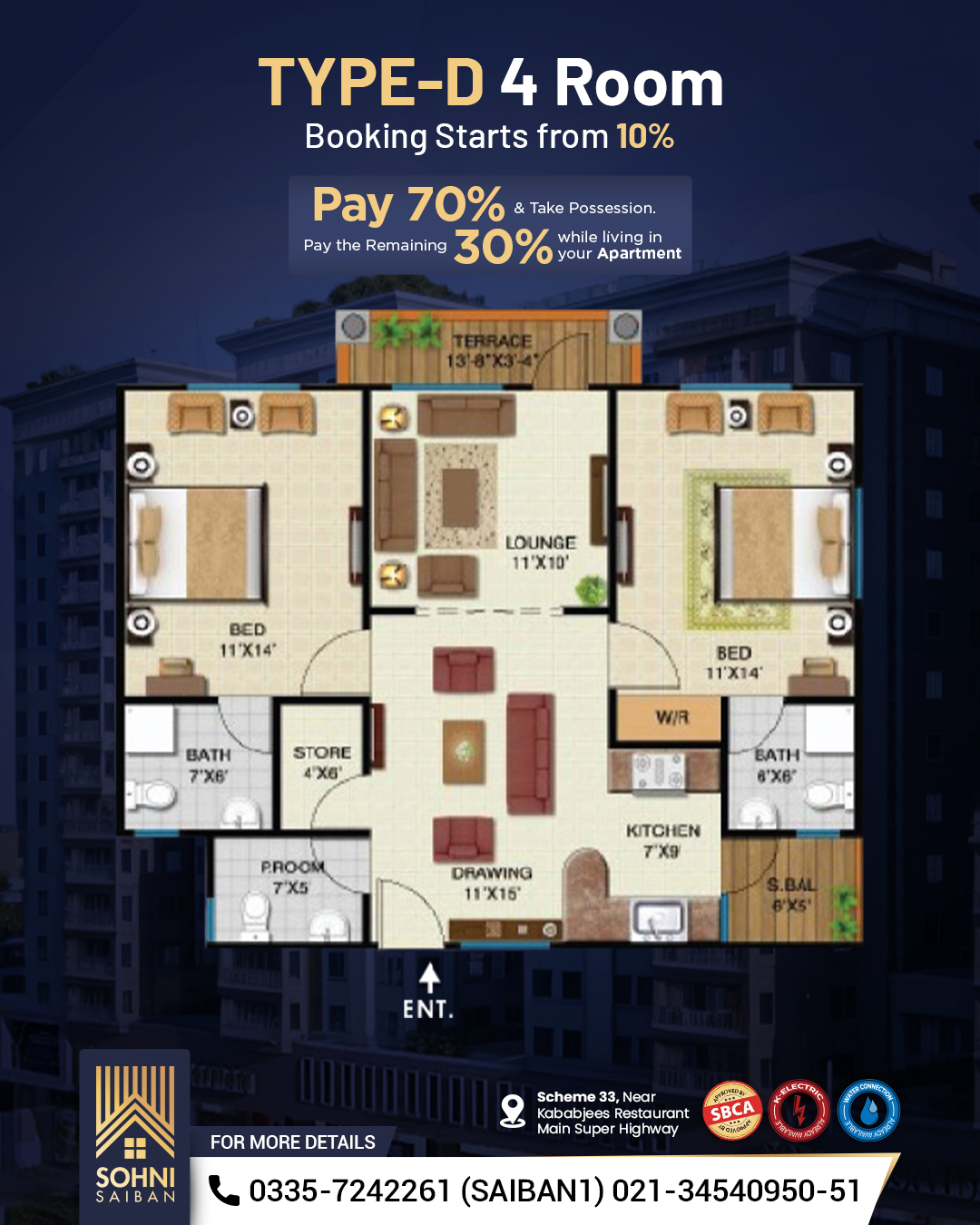Sohni Saiban is a luxurious residential project by Noble Group, offering modern 3- and 4-room apartments with world-class amenities at a prime location in Scheme 33, Karachi. Strategically situated near Daewoo Terminal, adjacent to Khan Sahab Restaurant, and just 20 minutes from I.I Chundrigar Road, the project ensures easy access to major universities, hospitals, parks, and commercial hubs.