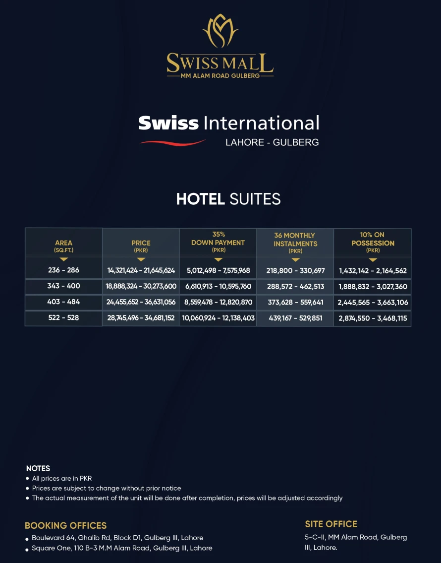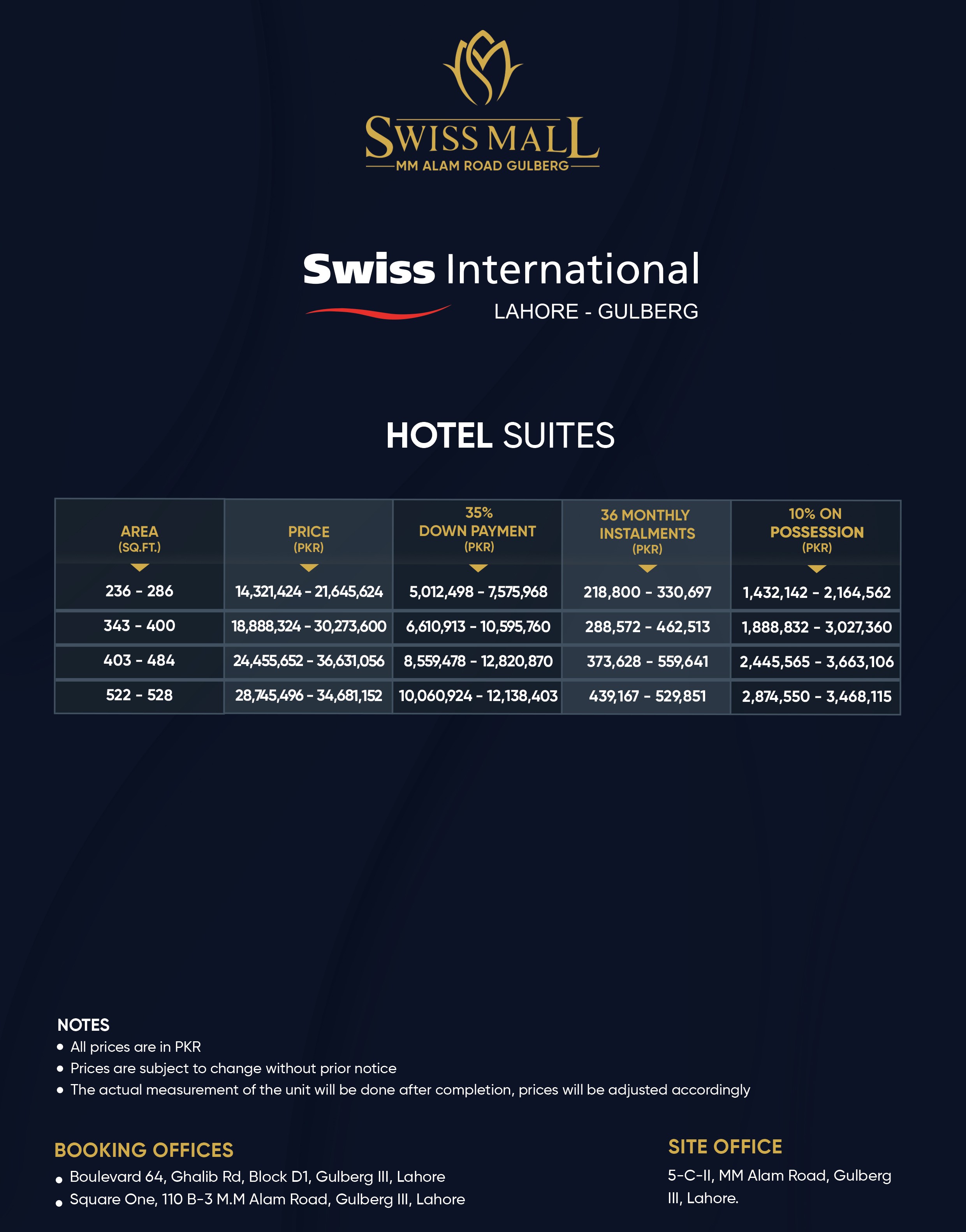 Swiss Mall Gulberg offers a versatile mix of spaces designed for residents, investors, and businesses: