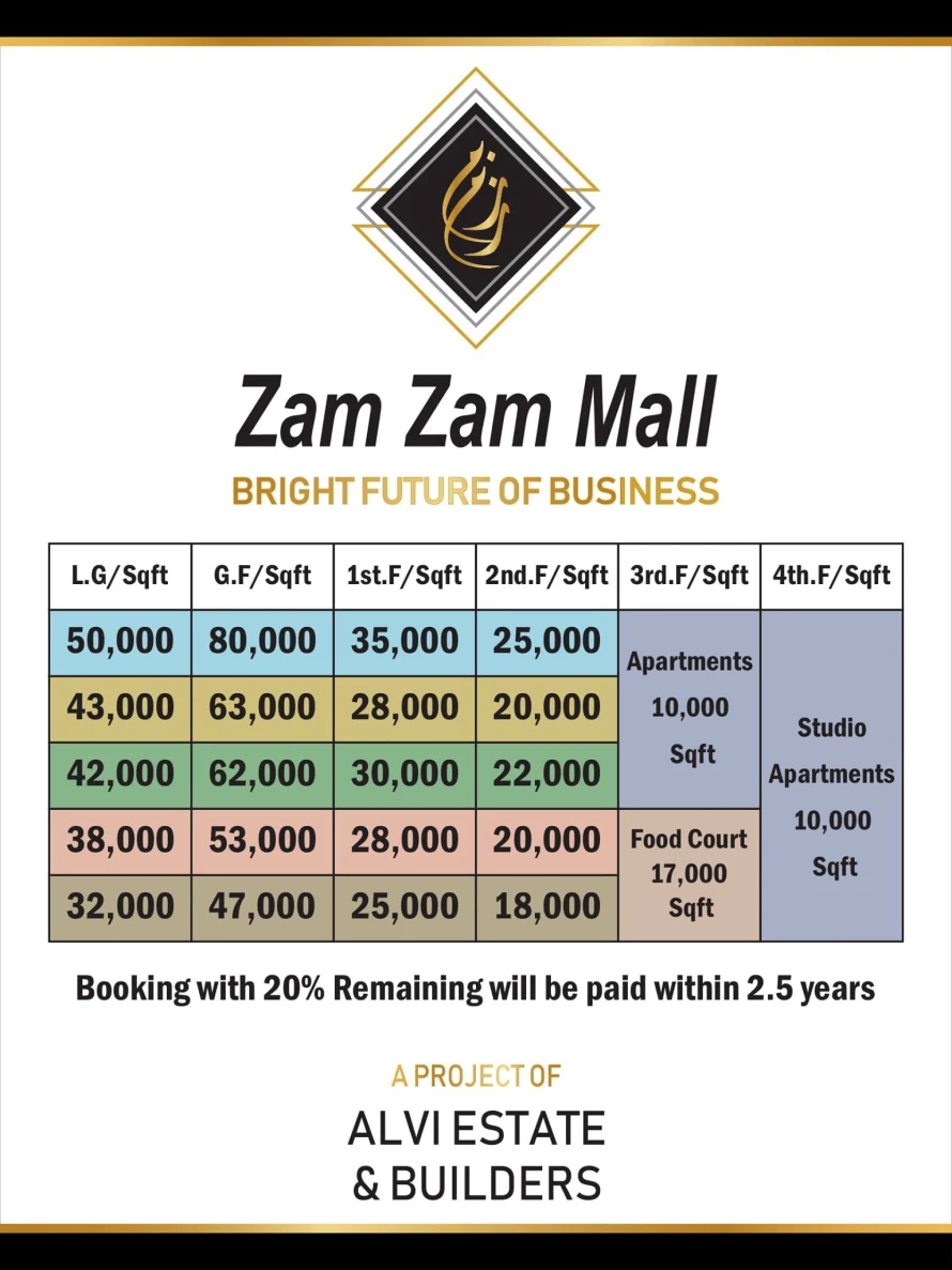 Zam Zam Mall is the latest commercial and residential project by Alvi Estate & Builders, a reputable real estate development firm renowned for delivering high-quality commercial high-rises with guaranteed on-time completion. The developer’s successful portfolio includes Pakistan Mall, Heaven Mall, Alvi Grand Mall, and Al-Jannat Mall, reflecting their strong market credibility and expertise.