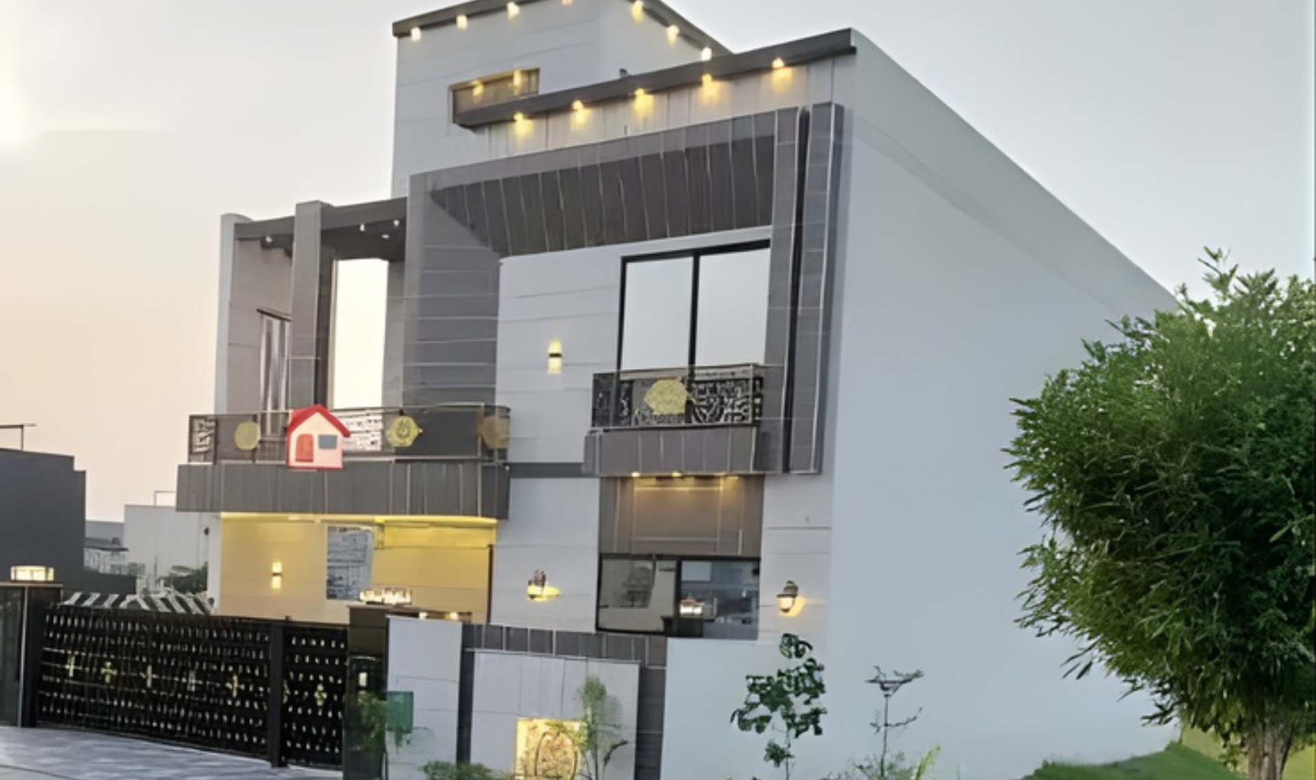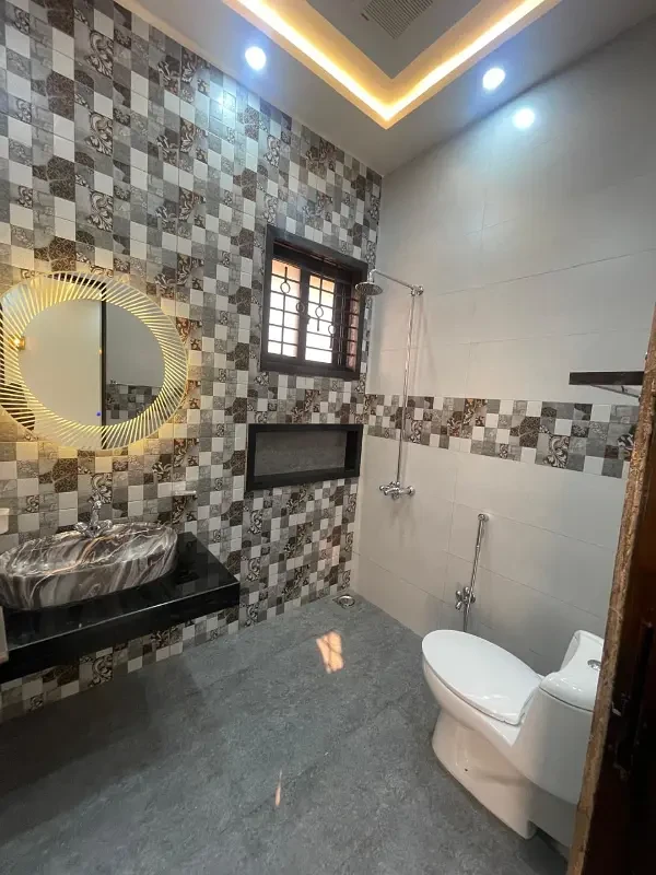 It features 5 spacious bedrooms with attached bathrooms, a stylish drawing and dining area, a modern kitchen with premium fittings, and TV lounges on each floor. Additional highlights include a powder room, a servant quarter with an attached bath, parking for 2 vehicles, and a beautifully crafted front elevation with imported tiles, fittings, and elegant lighting design.