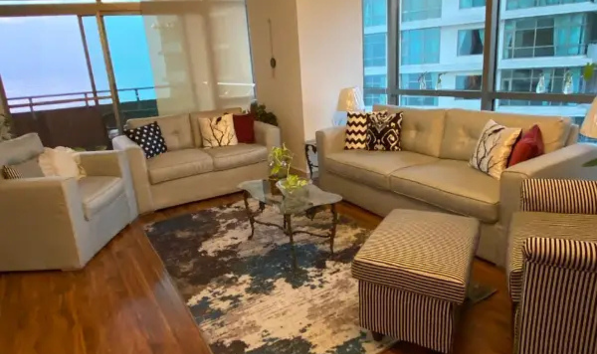A luxurious 4-bedroom sea-facing apartment is available for rent at Pearl Tower, Emaar Oceanfront, Karachi, with west-open sunset views. This fully furnished apartment spans 3,200 sq. ft. and features 4 bedrooms with bed sets, a maid room, powder room, servant quarters, a central lounge & dining area with 4-ton A/C, open kitchen with high-end fixtures, dirty kitchen, laundry room, storage, and sea-facing balconies from both living and bedrooms. The apartment is in pristine condition, fully renovated, and includes modern furniture, curtains, décor, and accessories.