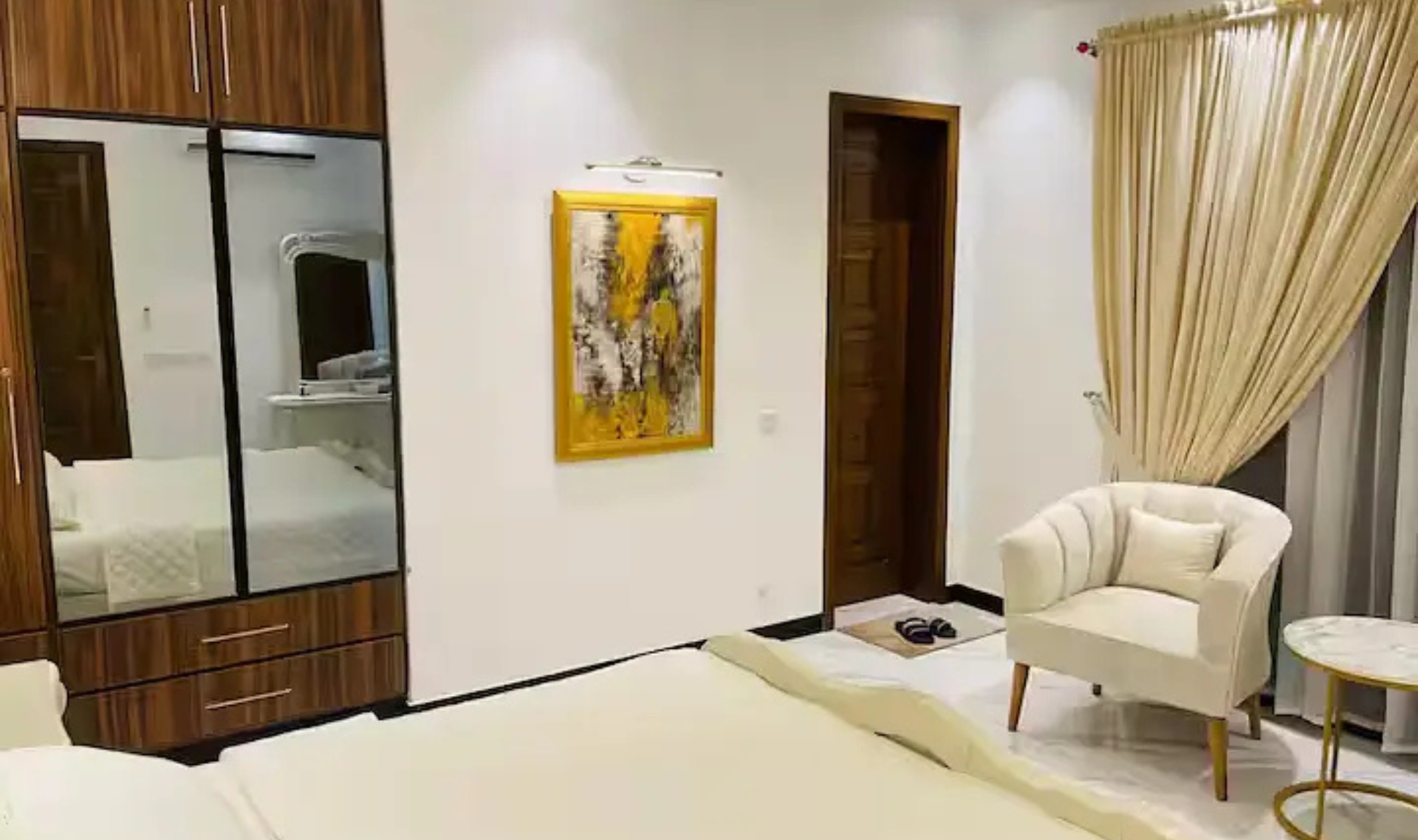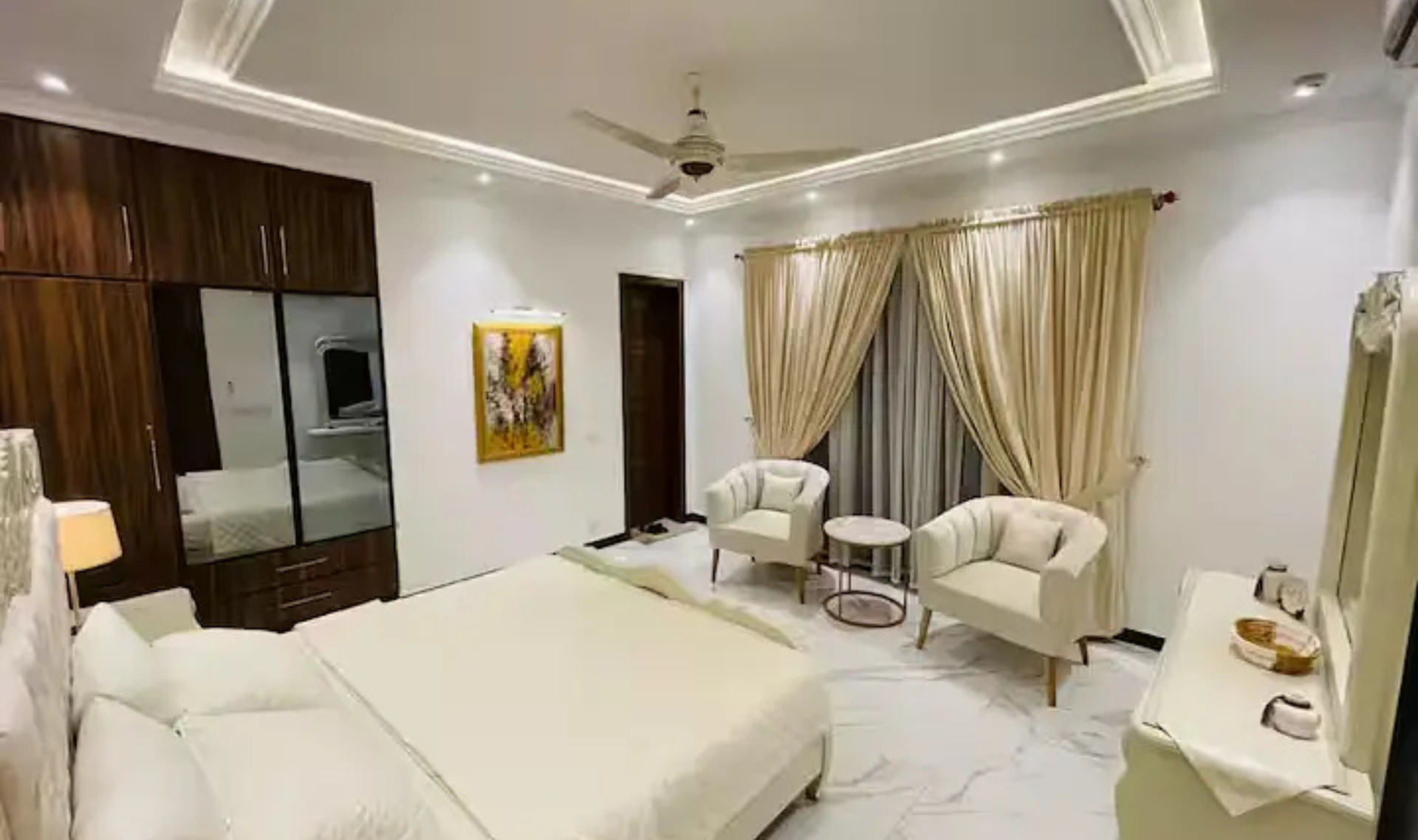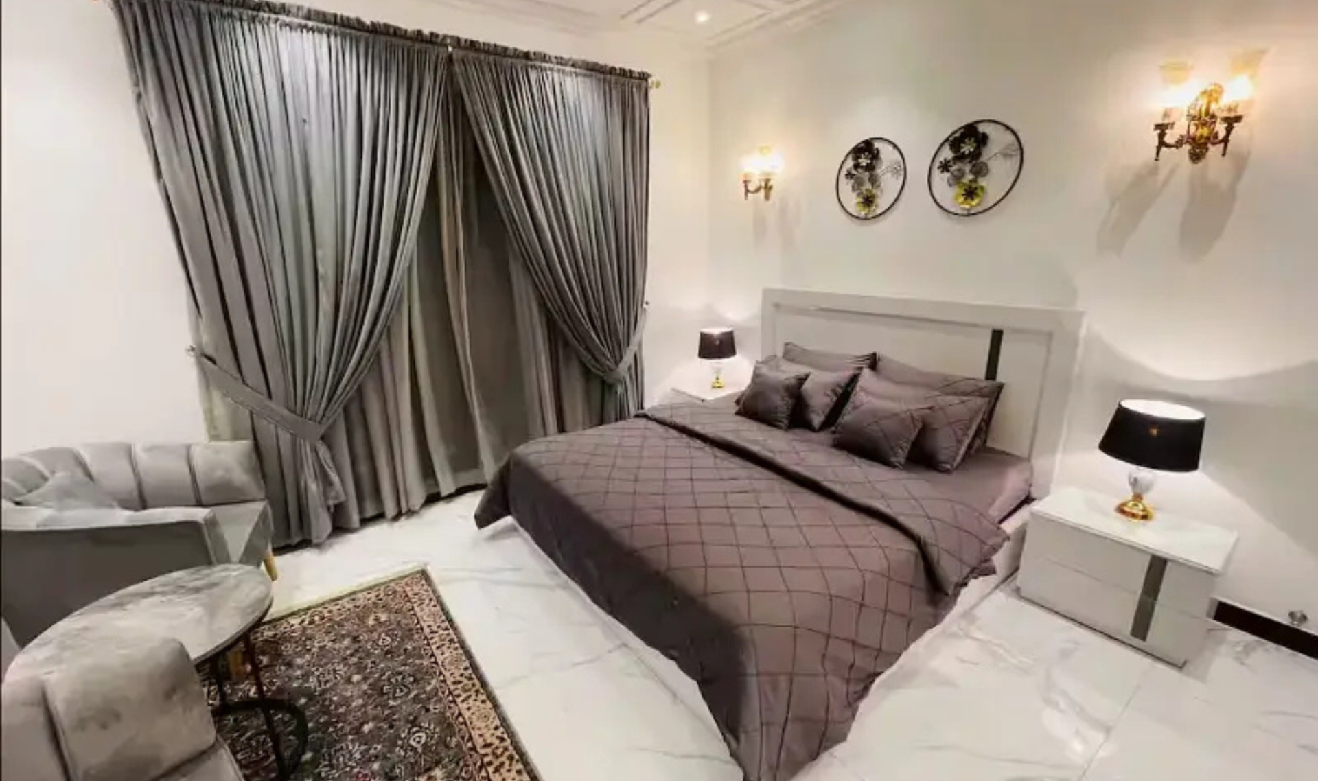 This two-bedroom fully furnished luxury apartment is available for rent at a reasonable budget. The apartment offers a comfortable and modern lifestyle with stylish furniture, including comfortable beds, wardrobes, sofa set, coffee table, and smart TV. The living area is bright and airy, creating a relaxing environment for residents.