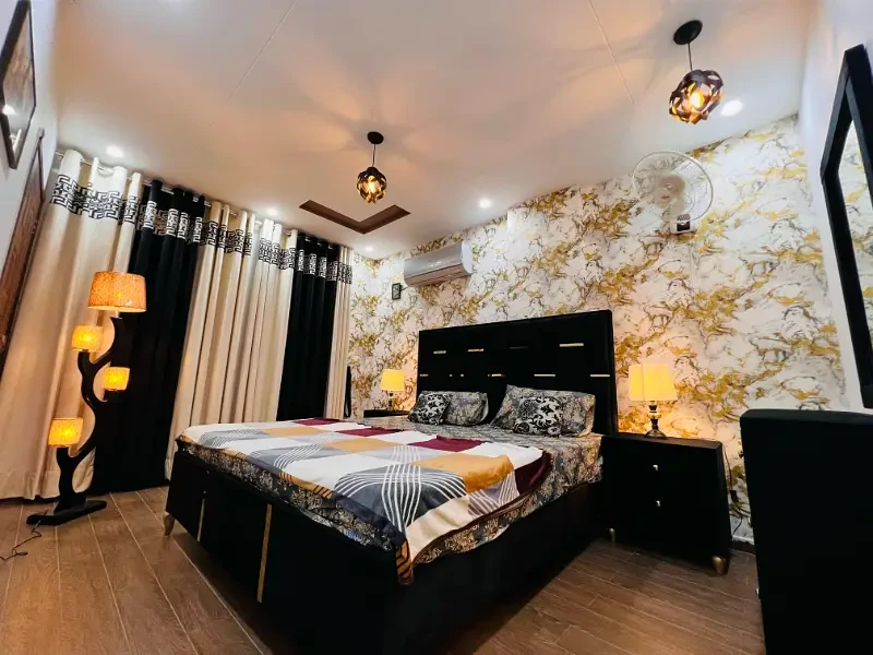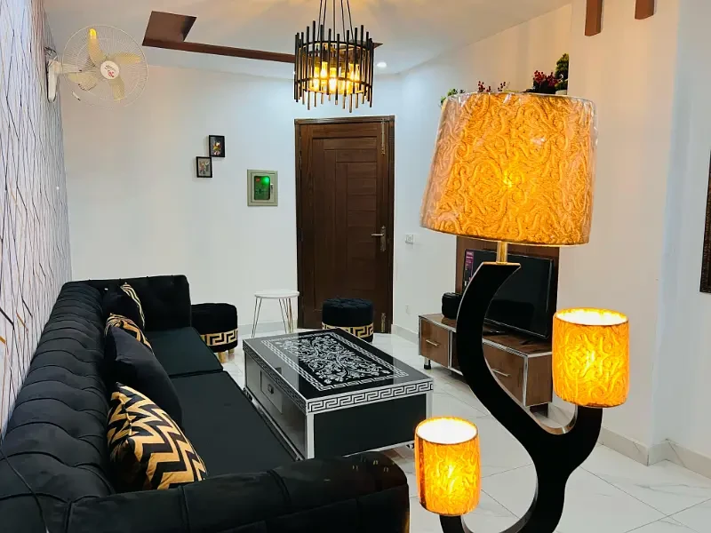 A fully furnished 1-bedroom apartment is available for short-term rent on 3500 in Iqbal Block, Bahria Town, Lahore, suitable for families and couples. The apartment includes 1 bedroom with attached bathroom, VIP TV lounge, and kitchen.
