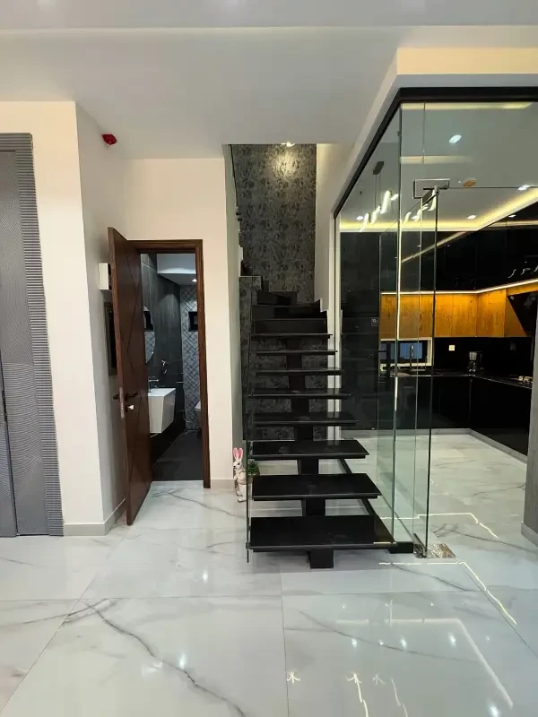 The house features three spacious bedrooms with attached bathrooms, a stylish drawing and dining area, and a wide TV lounge with elegant interiors. The modern kitchen is equipped with high-end fixtures, complementing the home’s premium finishes and solid construction. Additional amenities include a car parking space, terrace with a scenic view, laundry area, and a servant quarter (if applicable), ensuring comfort and practicality for daily living.