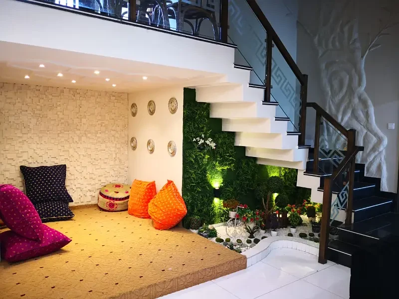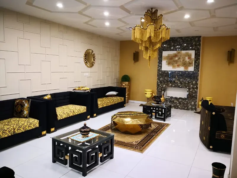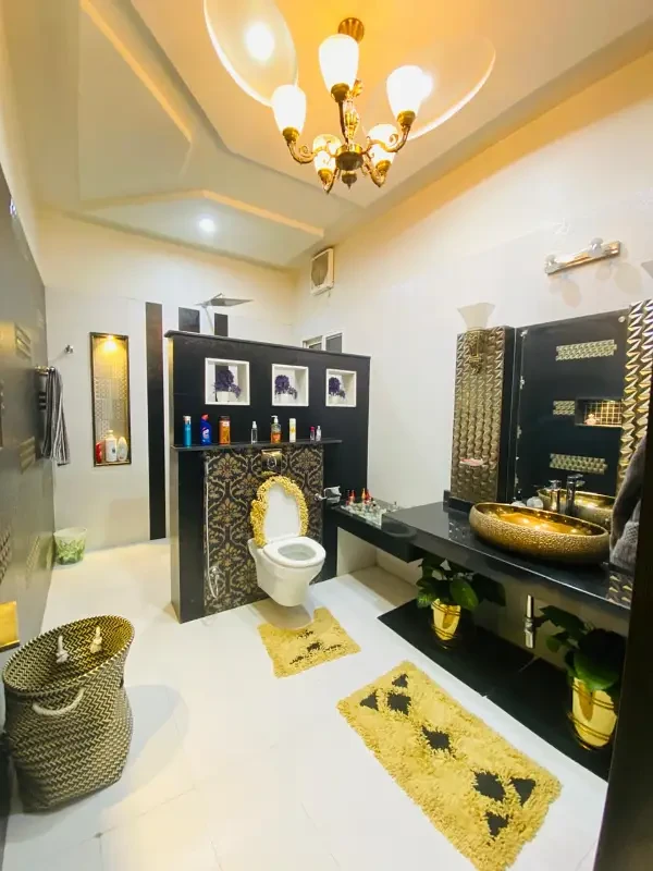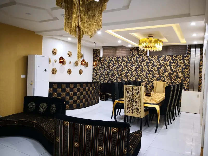 The house also features a servant quarter, a large car garage, and a lush green lawn. Built with solid construction and premium materials, it offers imported Irani tile and granite flooring, featured walls with imported bonsai planters, and double-glazed windows for a refined touch. It comes equipped with central air conditioning, central heating, and luxurious amenities such as a swimming pool, sauna, and Jacuzzi.