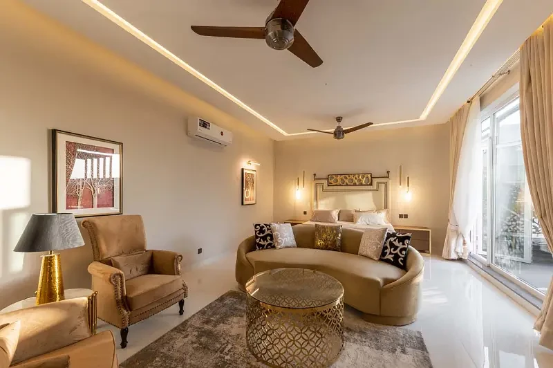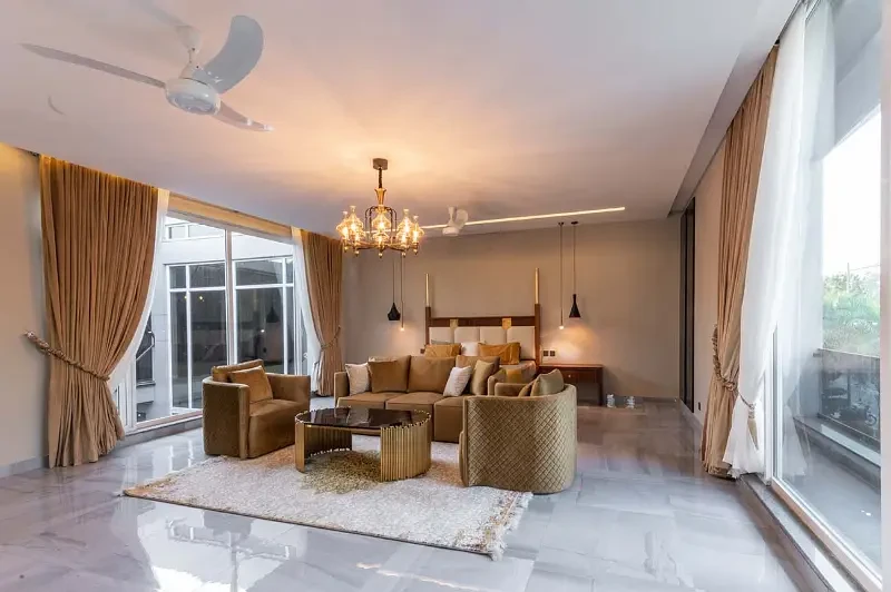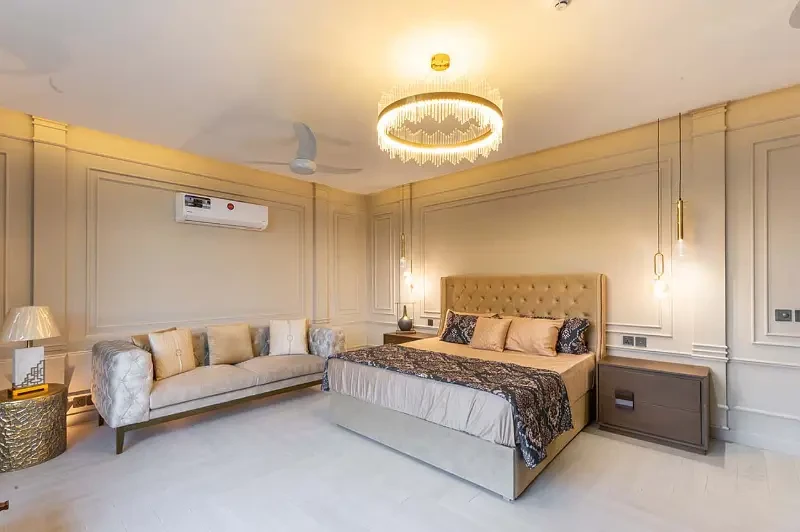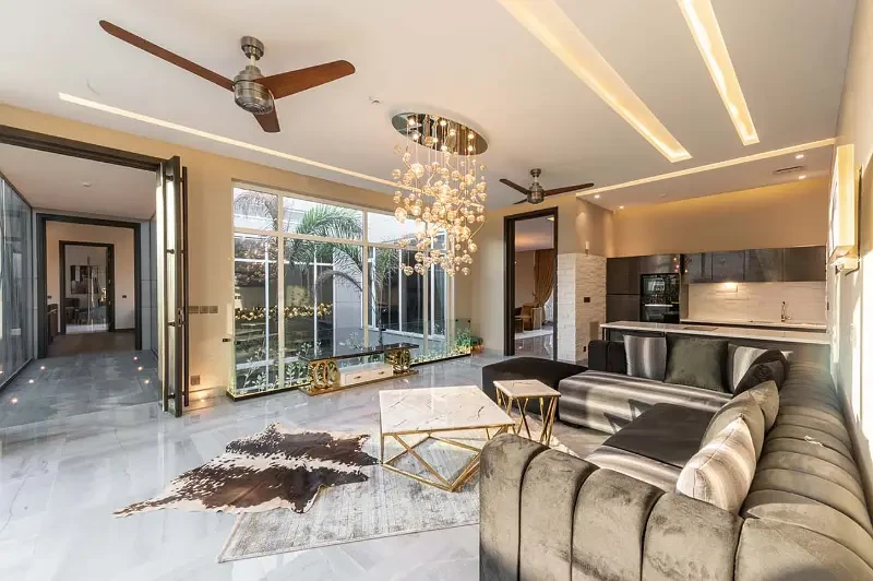 This dream bungalow features 5 master bedrooms with attached baths, 3 fully equipped kitchens, 2 TV lounges, a drawing and dining room, prayer room, store room, and 2 servant quarters in the basement. Complete UPS and generator wiring is installed, with solid steel work for the main gate and premium marble, tiled, and wooden flooring throughout.