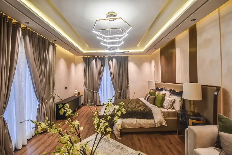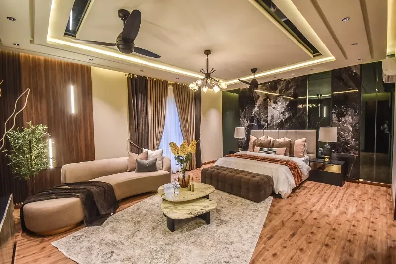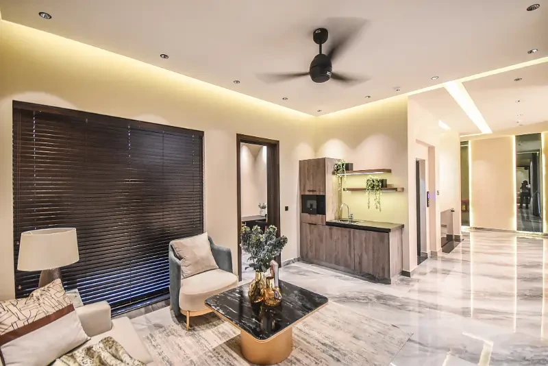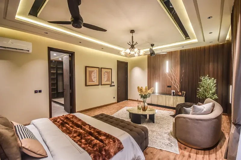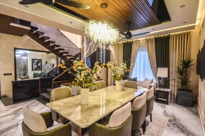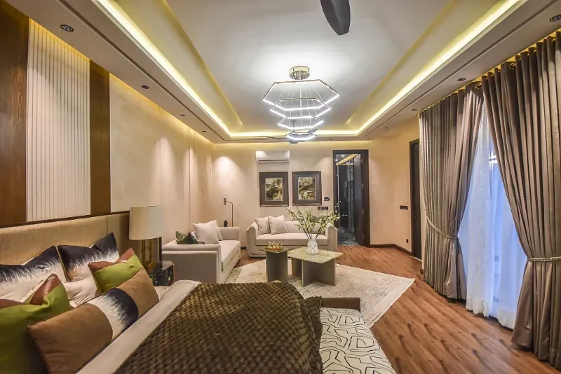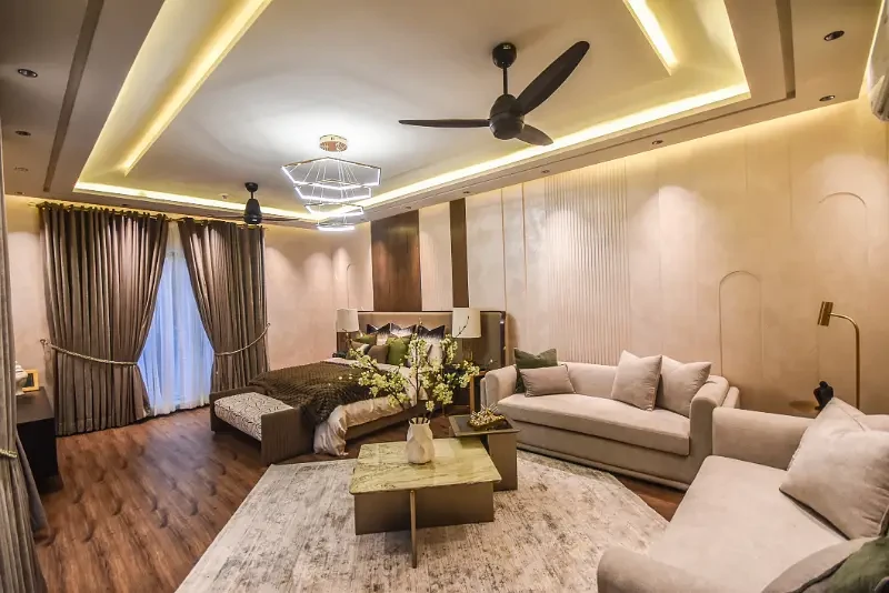 This slightly used, owner-built 1 Kanal bungalow offers 5 spacious bedrooms with attached baths, 2 TV lounges, drawing and dining rooms, and 2 fully equipped kitchens. The house features tiles and wooden flooring, solid wood doors, and elegant false ceiling designs for a luxurious living experience.