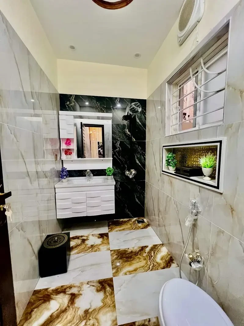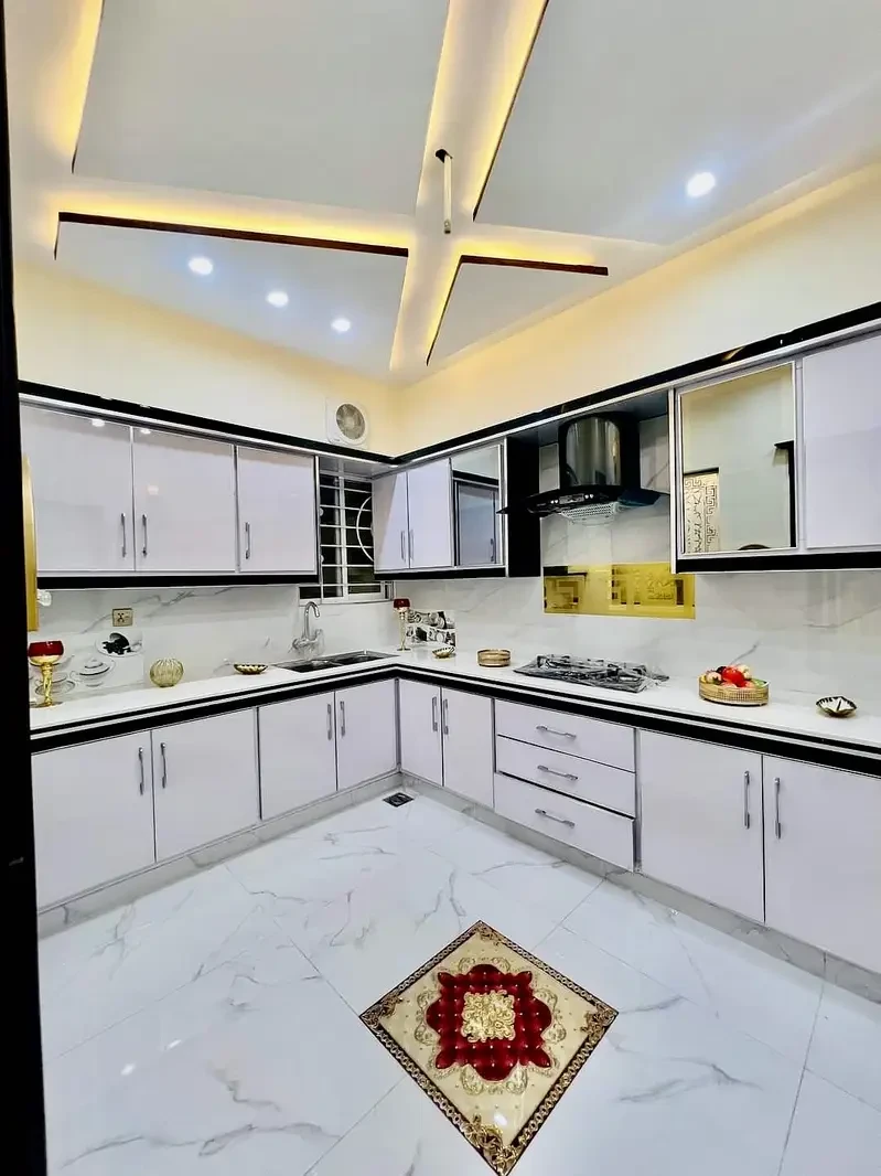 The house features 5–6 spacious bedrooms with attached bathrooms, 2 stylish kitchens, 2 TV lounges, a lavish drawing & dining room, powder room, and store room. Built with AAA construction standards, it includes all-tiled flooring, solid wooden doors, imported fittings, Ash woodwork, and Spanish-style kitchens.