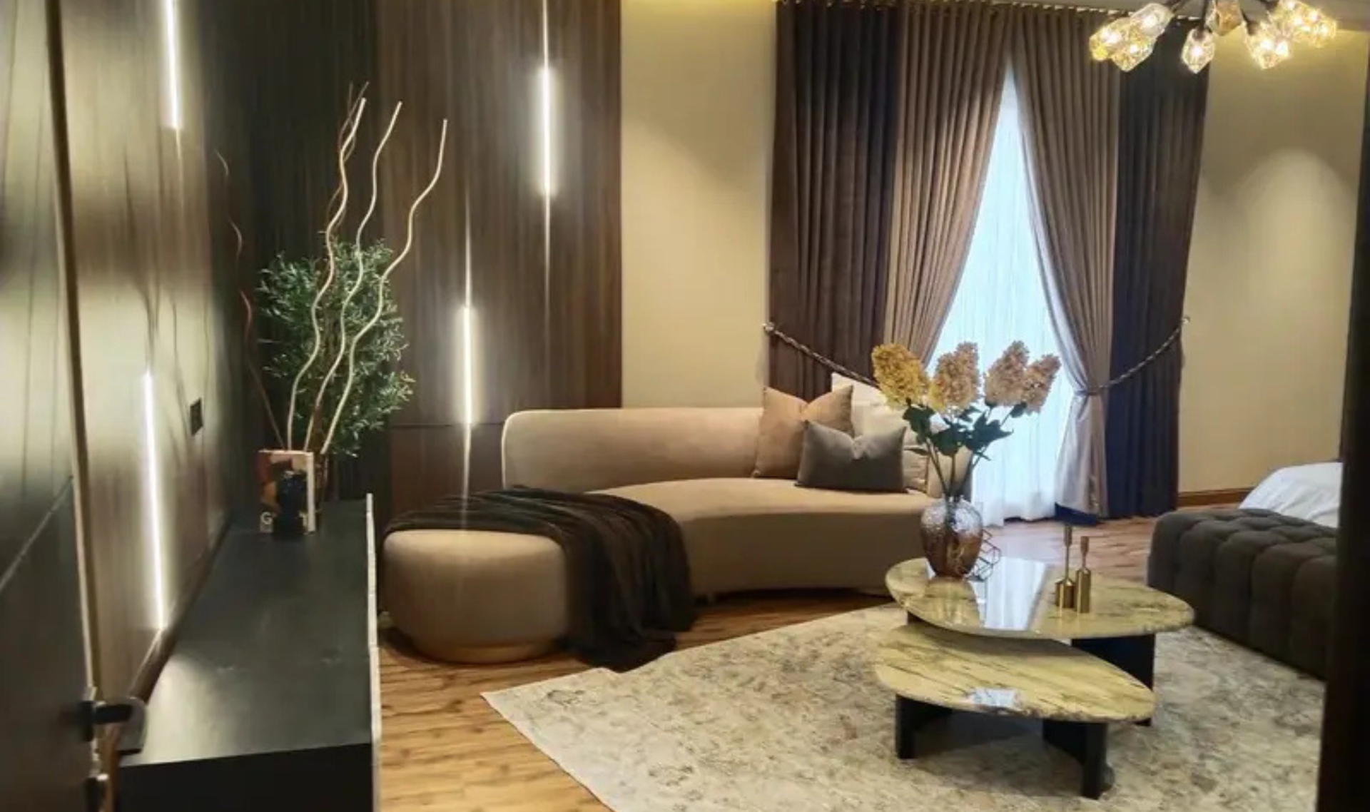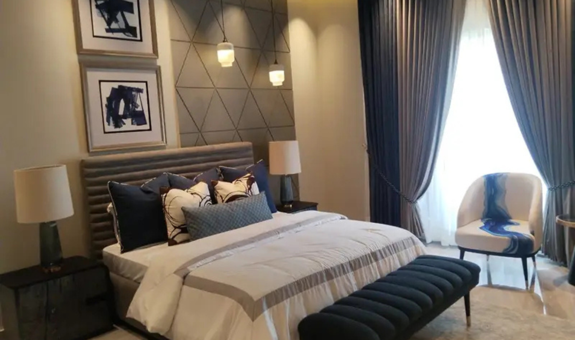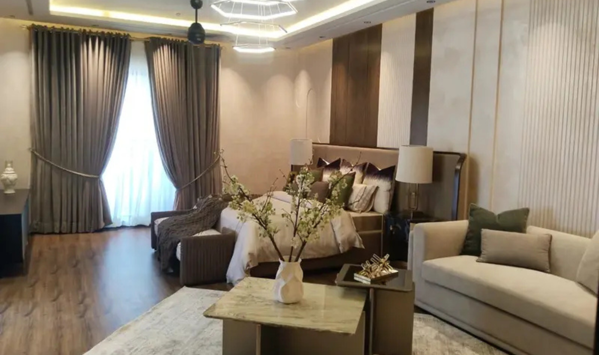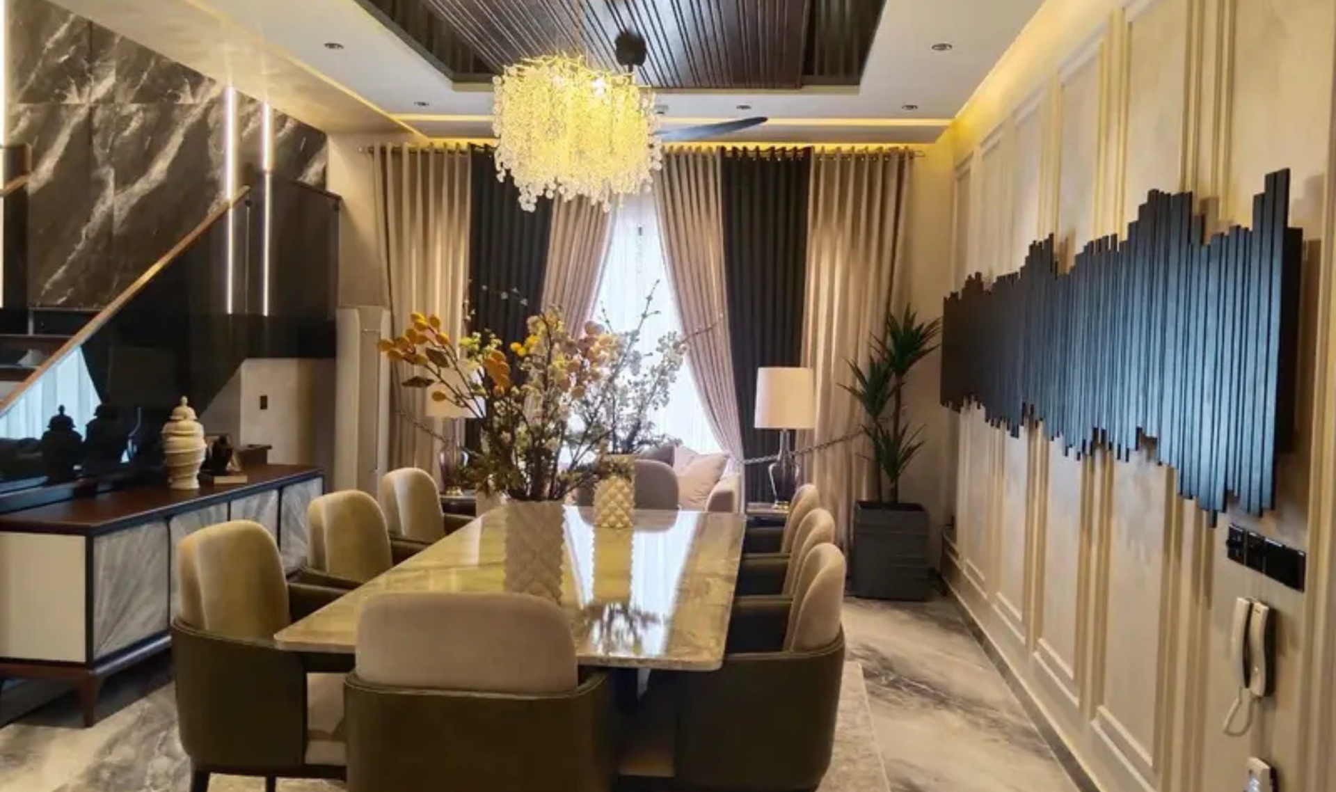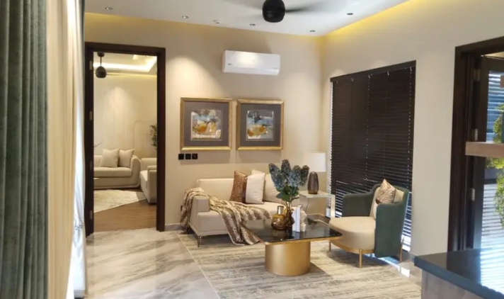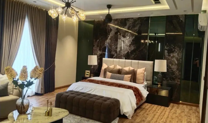 This elegant bungalow offers 5 spacious bedrooms with attached bathrooms, along with modern living spaces including TV lounge, drawing and dining areas. The kitchen is crafted by Chughtaiz and fitted with premium materials, while Dura tiles and imported fittings enhance the overall luxury.