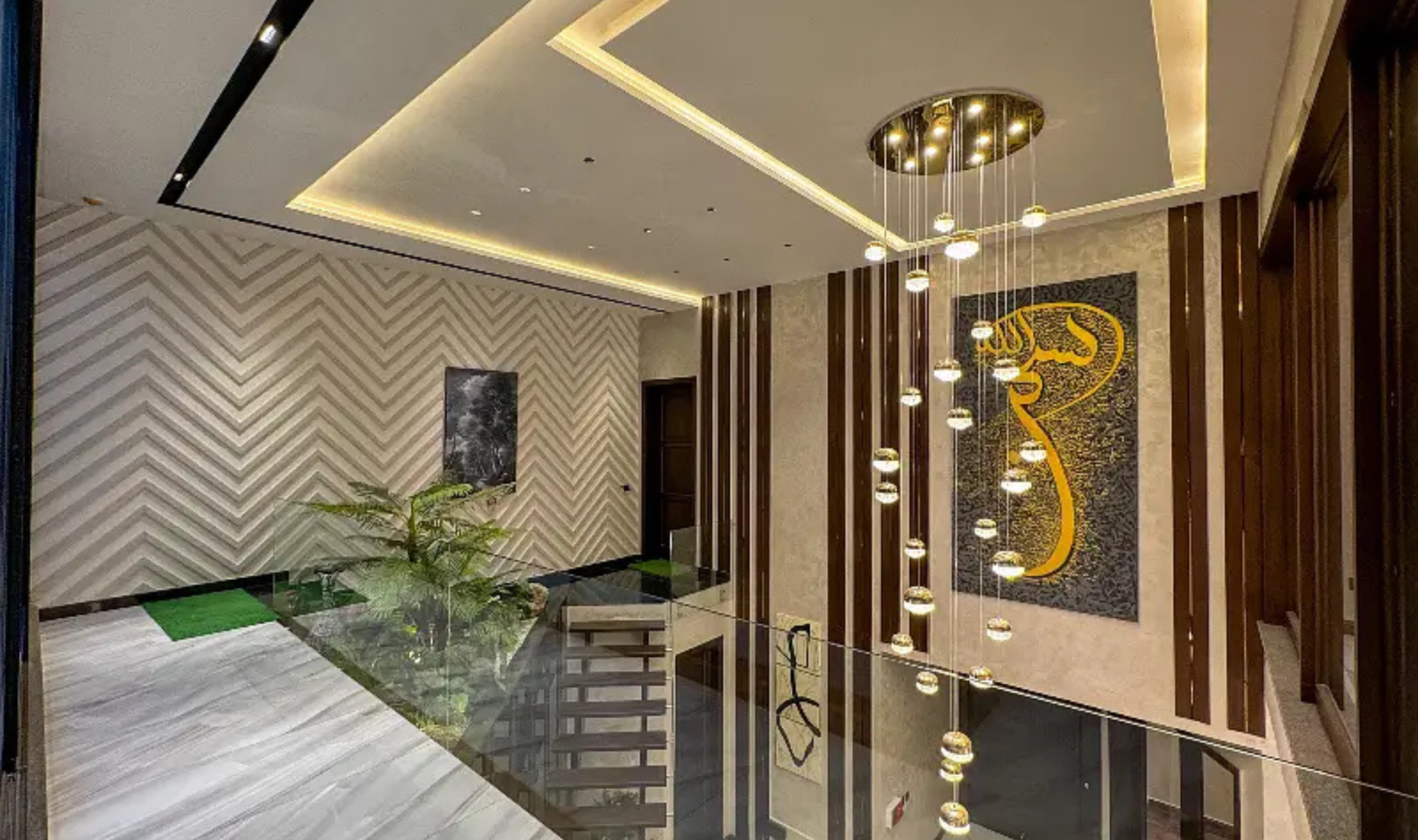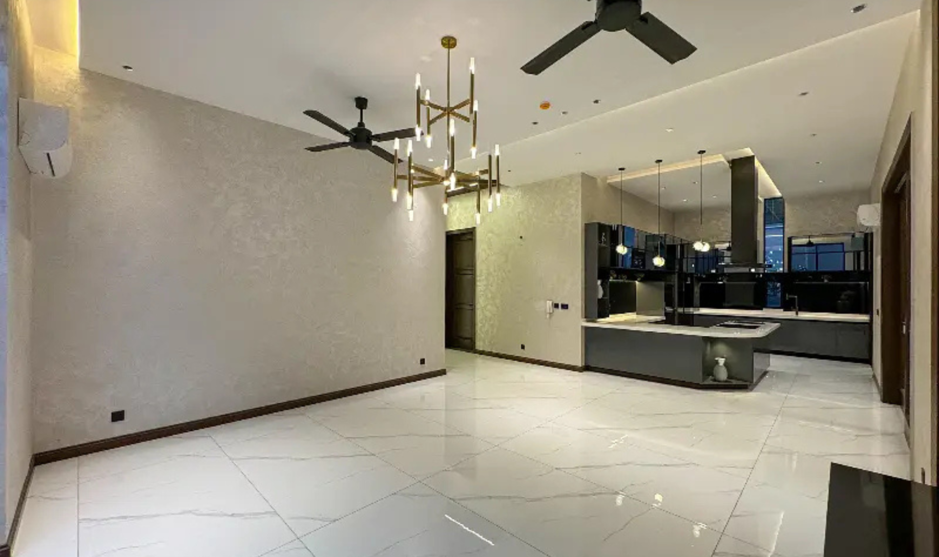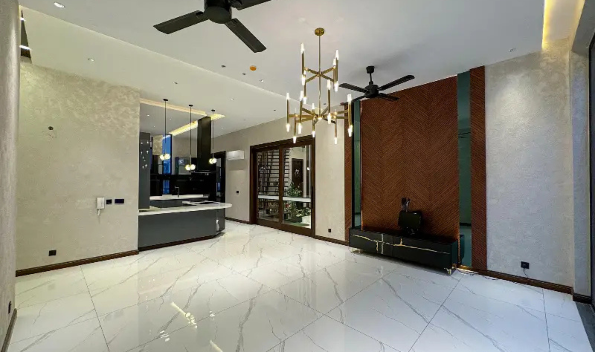 This stunning modern-designed house offers 5 master bedrooms with attached shower tub baths, a powder room, study room, and two stylish kitchens. The home features elegant wooden work, fully marble and tiled flooring, a big TV lounge, drawing and dining room, and store rooms for added convenience. A basement with two servant quarters enhances functionality and space.