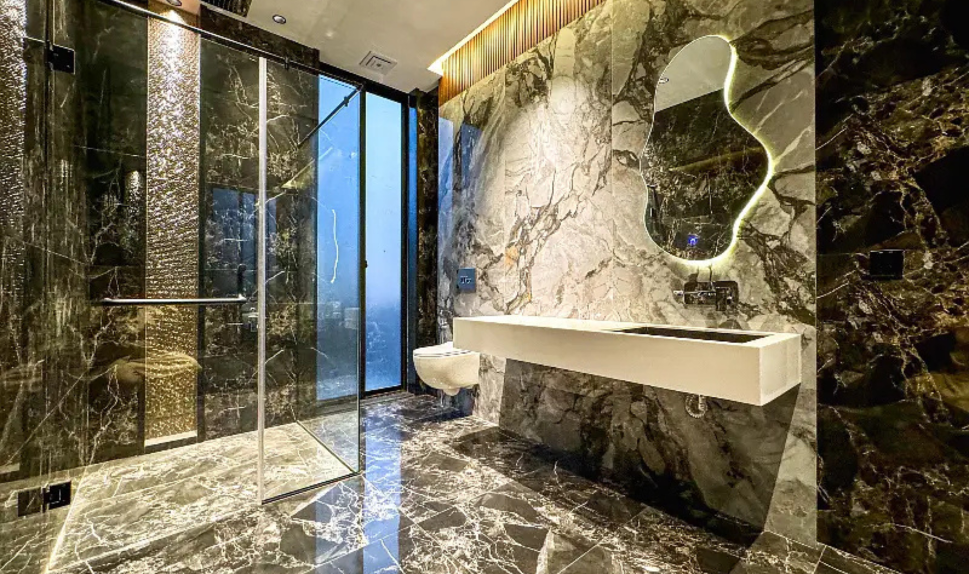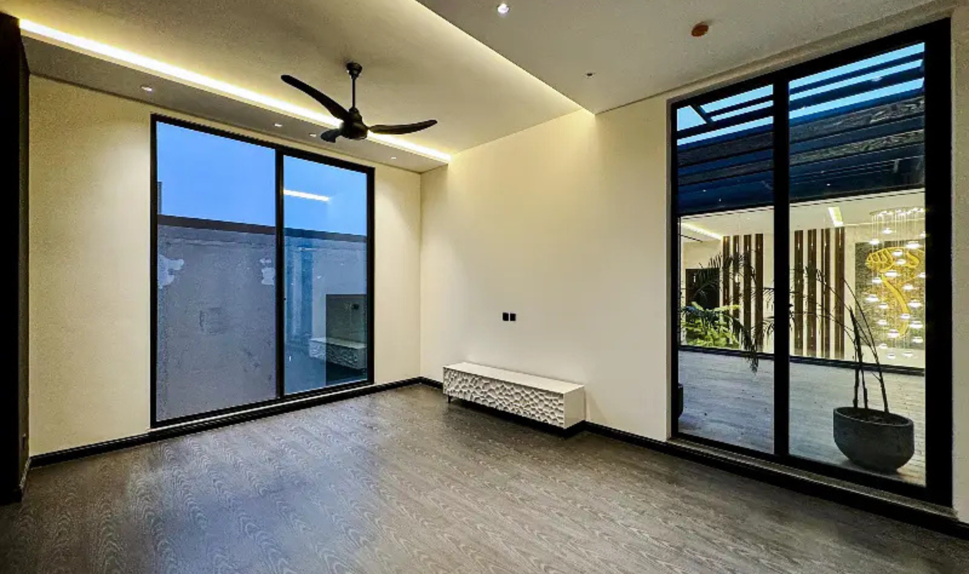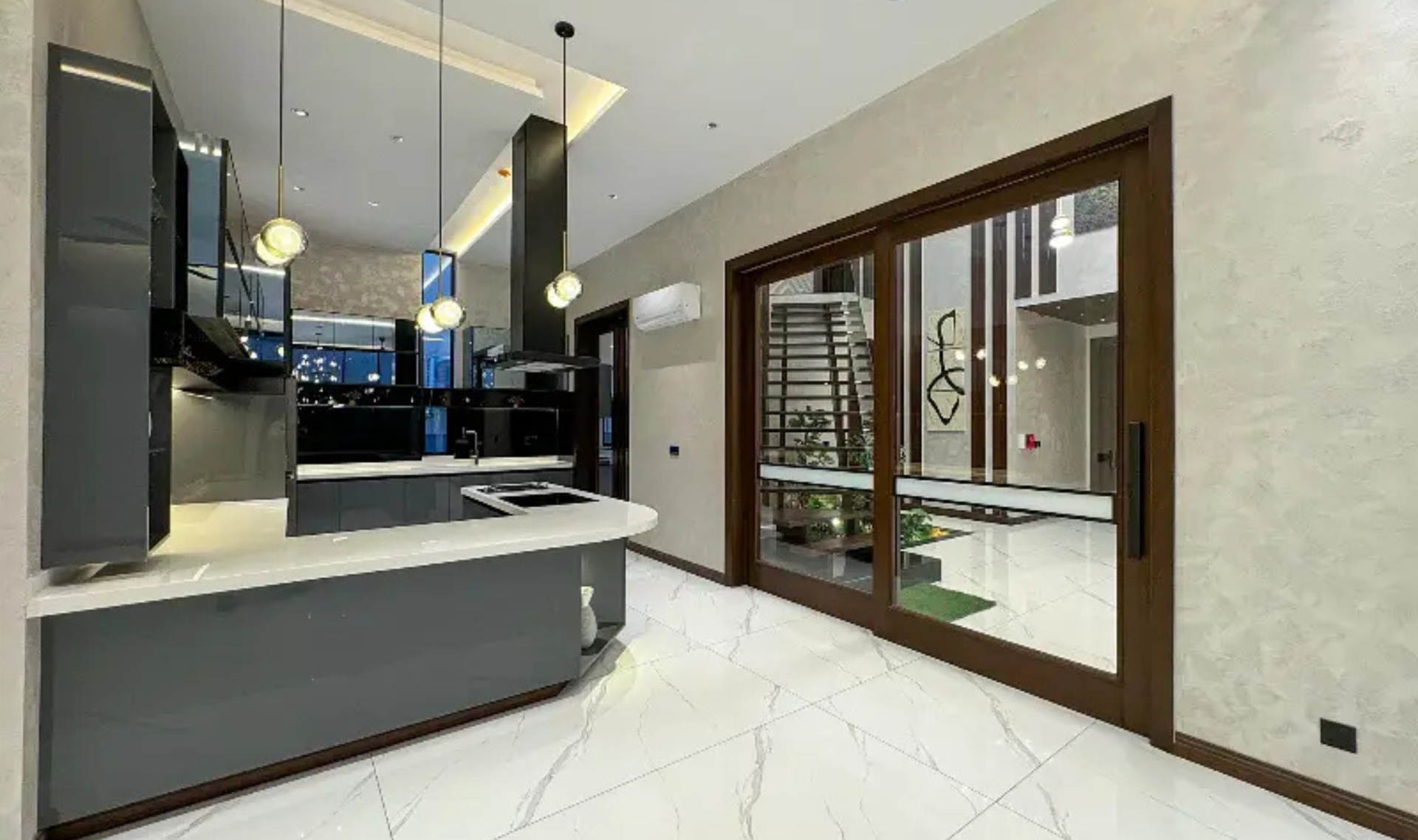 This stunning modern-designed house offers 5 master bedrooms with attached shower tub baths, a powder room, study room, and two stylish kitchens. The home features elegant wooden work, fully marble and tiled flooring, a big TV lounge, drawing and dining room, and store rooms for added convenience. A basement with two servant quarters enhances functionality and space.