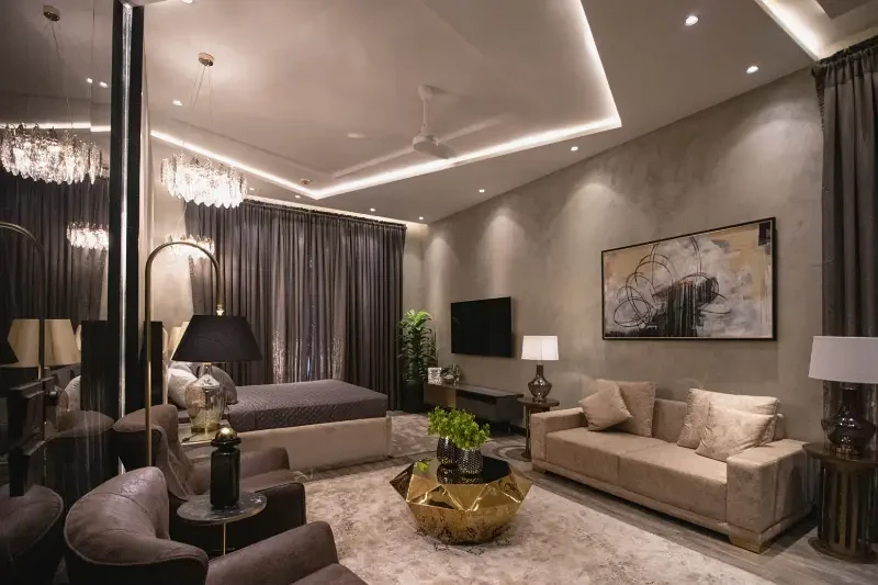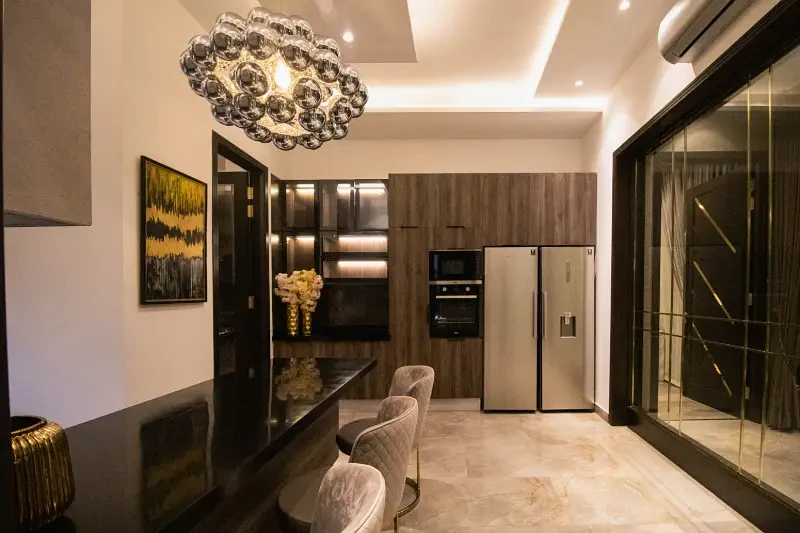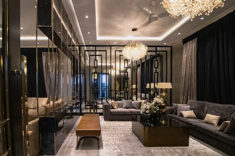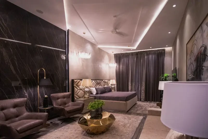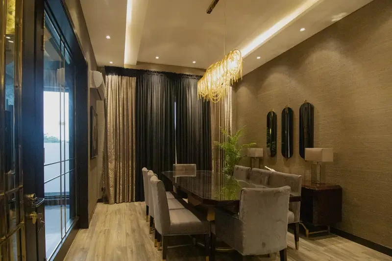 This stunning brand-new designer house offers a luxurious lifestyle with modern architecture, high-quality materials, and elegant interior detailing. The home features stylish wooden and tiled flooring, solid wooden doors, beautiful false ceilings, and thoughtfully designed living spaces including a drawing room, dining area, TV lounges, and spacious servant facilities. The basement hall adds extra versatility, perfect for entertainment or gatherings.