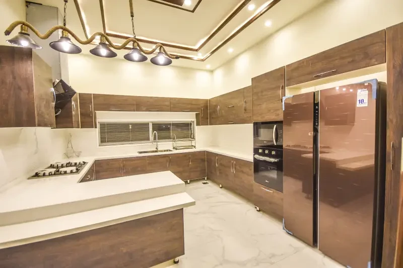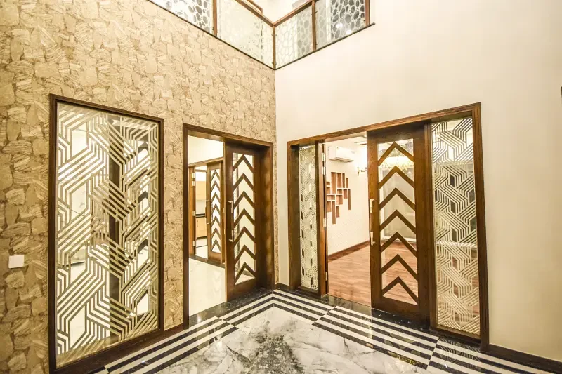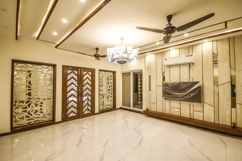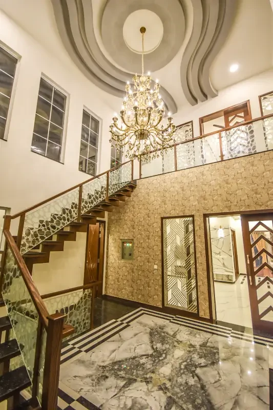 Task Real Estate presents a luxurious 1-Kanal ultra-modern bungalow in a prime location near Carrefour and Raya, DHA Phase 7, Lahore. The bungalow features 5 master bedrooms with attached baths, 6 bathrooms in total, 2 TV lounges, drawing and dining areas, 2 kitchens from Fotile, 2 servant quarters, and 4-car parking.