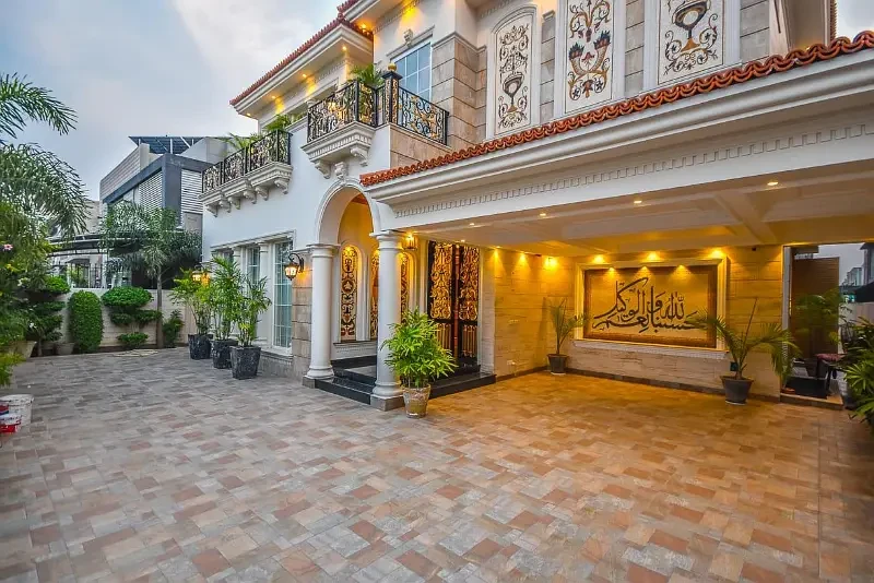 The outdoor area includes a lush green lawn, planters, a spacious green belt, and tiled side streets, all constructed according to DHA by-laws with superb elevation, making it an ideal choice for luxurious living in Lahore.