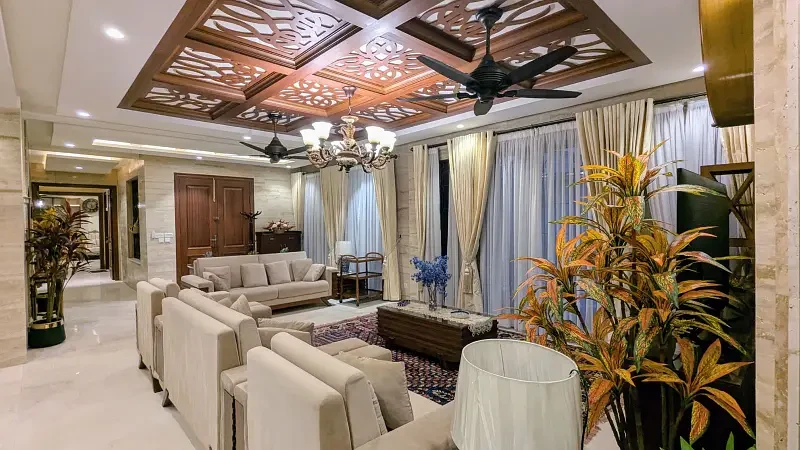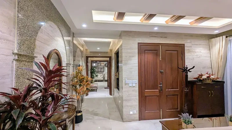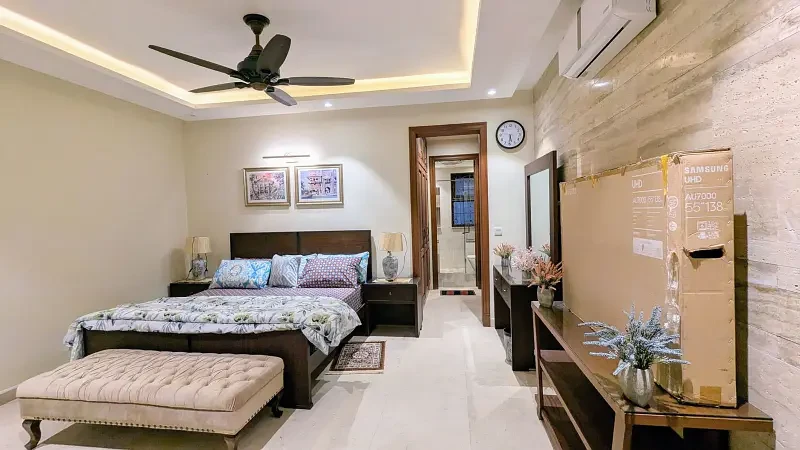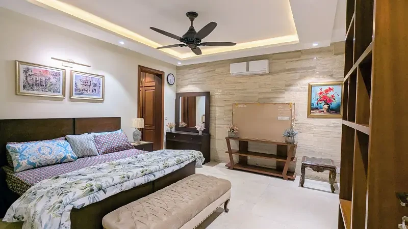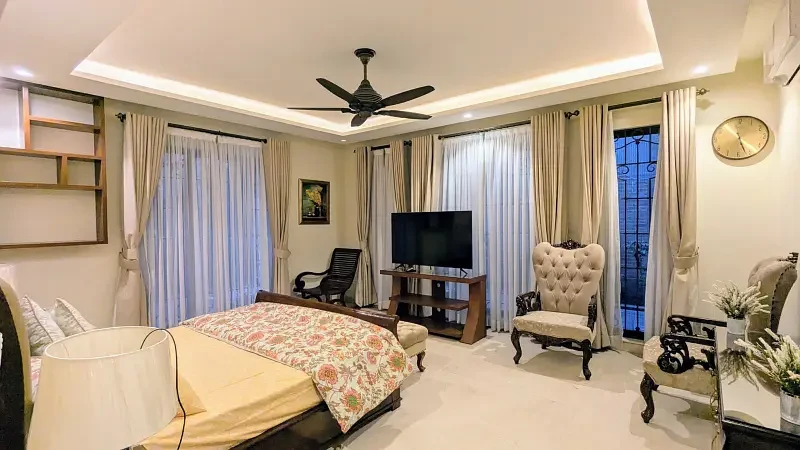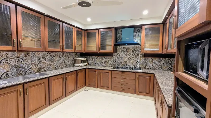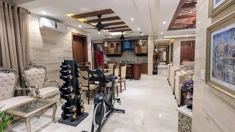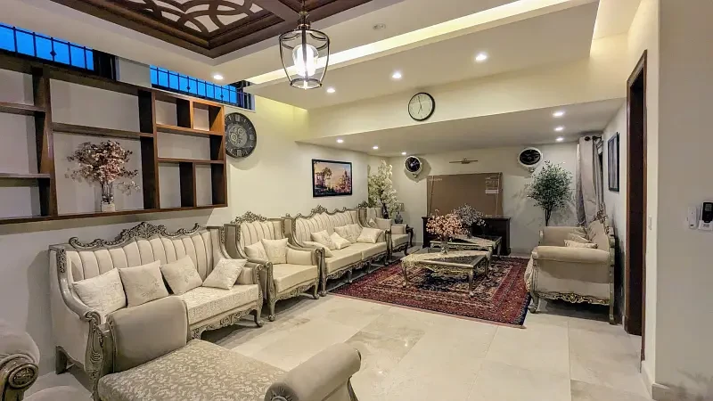 This luxurious 1 Kanal house in F-7/2, Islamabad, is fully furnished and designed for comfort and style. It features a main kitchen, open kitchen, dining space, drawing room, TV lounge, and a laundry area, along with an open courtyard for extra space and ventilation.