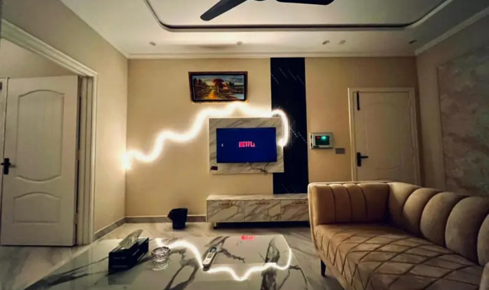 This 10 Marla upper portion offers a comfortable living space with 3 bedrooms, each with an attached bathroom, a TV lounge, kitchen, and store room. The property is designed for convenience and practical living.